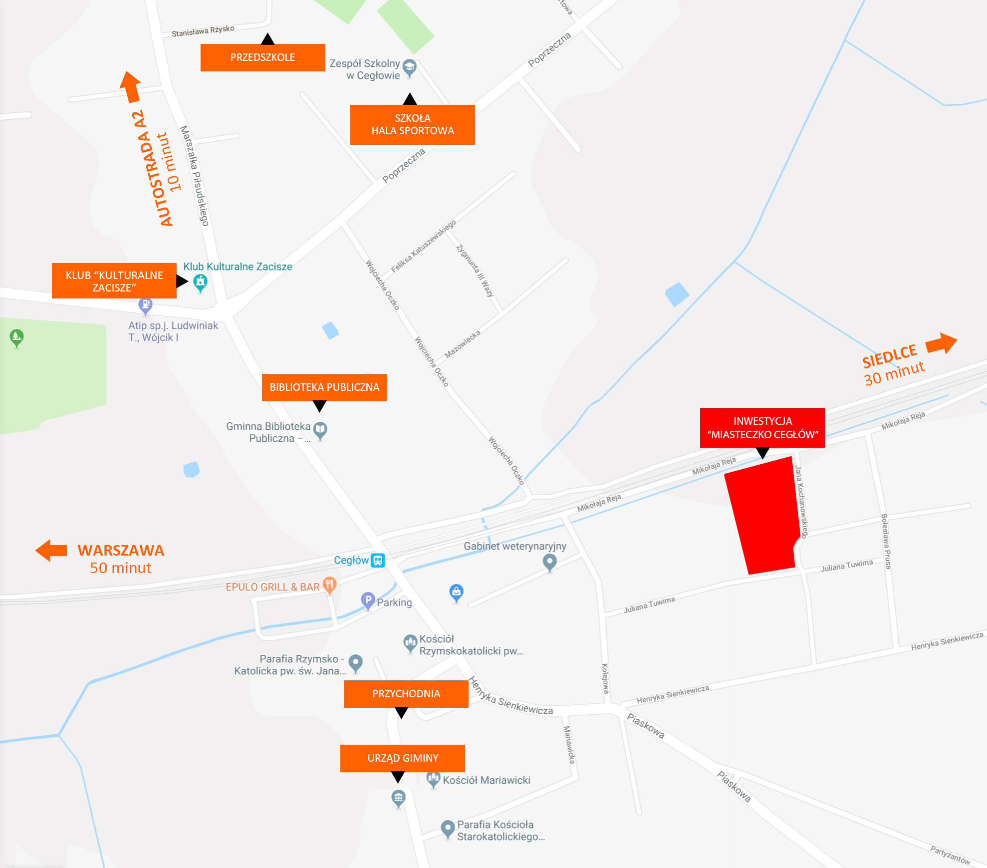 MIASTECZKO CEGŁÓW to doskonała lokalizacja. Bliskość autostrady A2 oraz niezwykle dogodny dojazd pociągiem do Warszawy, Mińska Mazowieckiego i Siedlec to ogromne zalety dla osób pracujących w miastach i jednocześnie ceniących ciszę po powrocie z pracy.