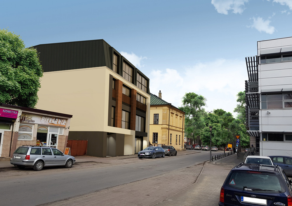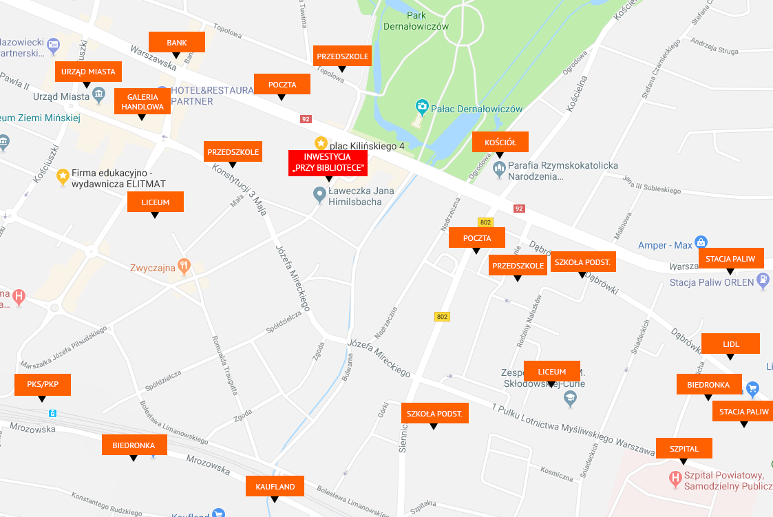 Przedsięwzięcie deweloperskie „Przy Bibliotece” jest pierwszą inwestycją w całości zrealizowaną przez E.D.S. BUDOWNICTWO Spółkę z o.o. Ten kameralny budynek zlokalizowany jest w Mińsku Mazowieckim przy ul. Józefa Piłsudskiego 2, obok Alei Gwiazd Literatury, vis’a’vis Miejskiej Biblioteki Publicznej (mapa), w zacisznej części ulicy łączącej się w tym miejscu ze skwerem przy Placu Kilińskiego (dawnym rynku Sendomierza). Najbliżsi sąsiedzi to: Powiatowa Stacja Sanepidu mieszcząca się w klasycystycznym budynku dawnego starostwa z XIX wieku oraz klasztor i księgarnia Sióstr Loretanek. W bliskiej odległości od budynku usytuowany jest urokliwy Park Miejski wraz z kompleksem pałacowym Dernałowiczów, będący wspaniałym terenem do aktywnego rodzinnego odpoczynku oraz kawiarnie i restauracje przy mińskim Deptaku. Natomiast w zasięgu kilkuset metrów znajdują się liczne sklepy, banki, przychodnie lekarskie, kościół, przystanki autobusowe, szkoły i przedszkola. Dogodny dojazd do Warszawy zapewnia bliskość stacji PKP (10 minut pieszo). Także duża ilość ogólnodostępnych miejsc parkingowych przy Placu Kilińskiego oraz przy ulicy Bulwarnej stanowi o atrakcyjności inwestycji „Przy Bibliotece”. Budynek doskonale wpisuje się w istniejącą przy ulicy Józefa Piłsudskiego zabudowę pierzejową. W zrealizowanej przez E.D.S. BUDOWNICTWO Sp. z o.o. nieruchomości, na parterze i 1. piętrze znajdują się lokale użytkowe z przeznaczeniem na działalność nieuciążliwą, natomiast na wyższych kondygnacjach usytuowane będą nowocześnie i praktycznie zaprojektowane mieszkania o zróżnicowanym metrażu. Inwestycja „Przy Bibliotece” dedykowana jest osobom chcącym mieszkać w centrum miasta i jednocześnie ceniącym kameralny klimat i spokój.